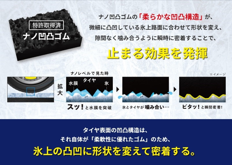 決め手はタイヤ表面の凹凸構造!氷上の凸凹とタイヤ表面の凹凸が、がっちり噛み合う。